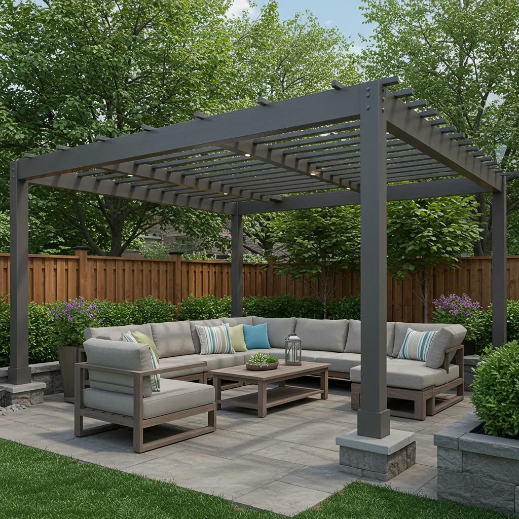 Transitional pergolaMixed materials, subtle ornamentationWood with metal accents, composite